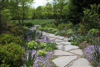 A flagstone and pea gravel path edged with granite cobblestones winds through the front yard of a Colonial farmhouse property in the Delaware Valley, Philadelphia.